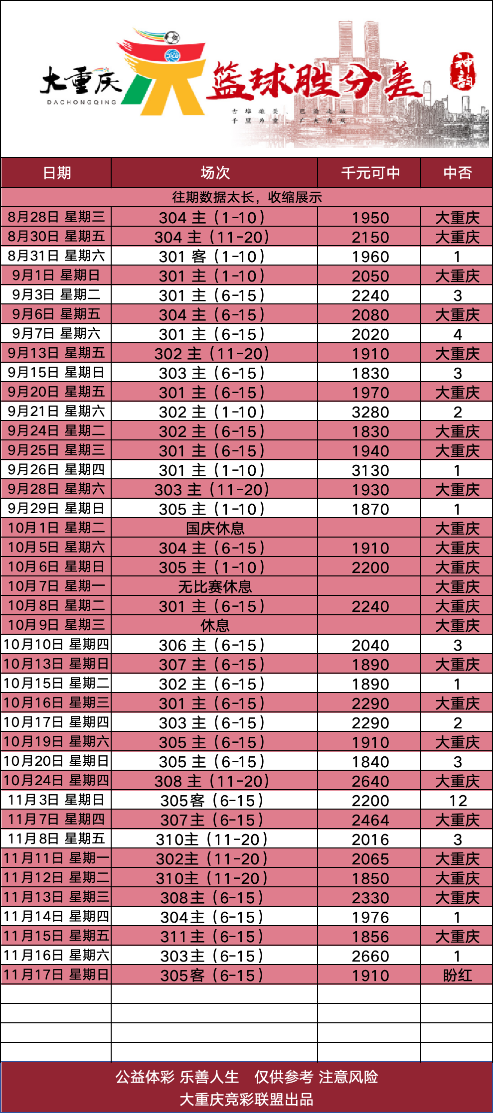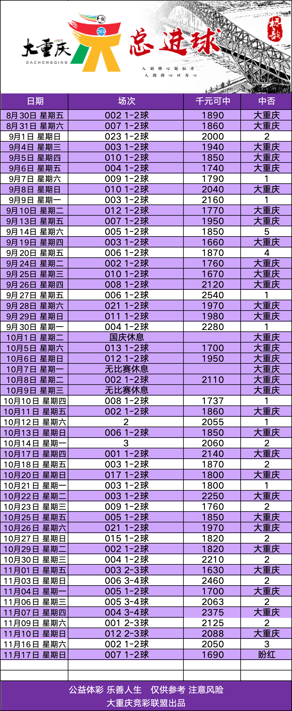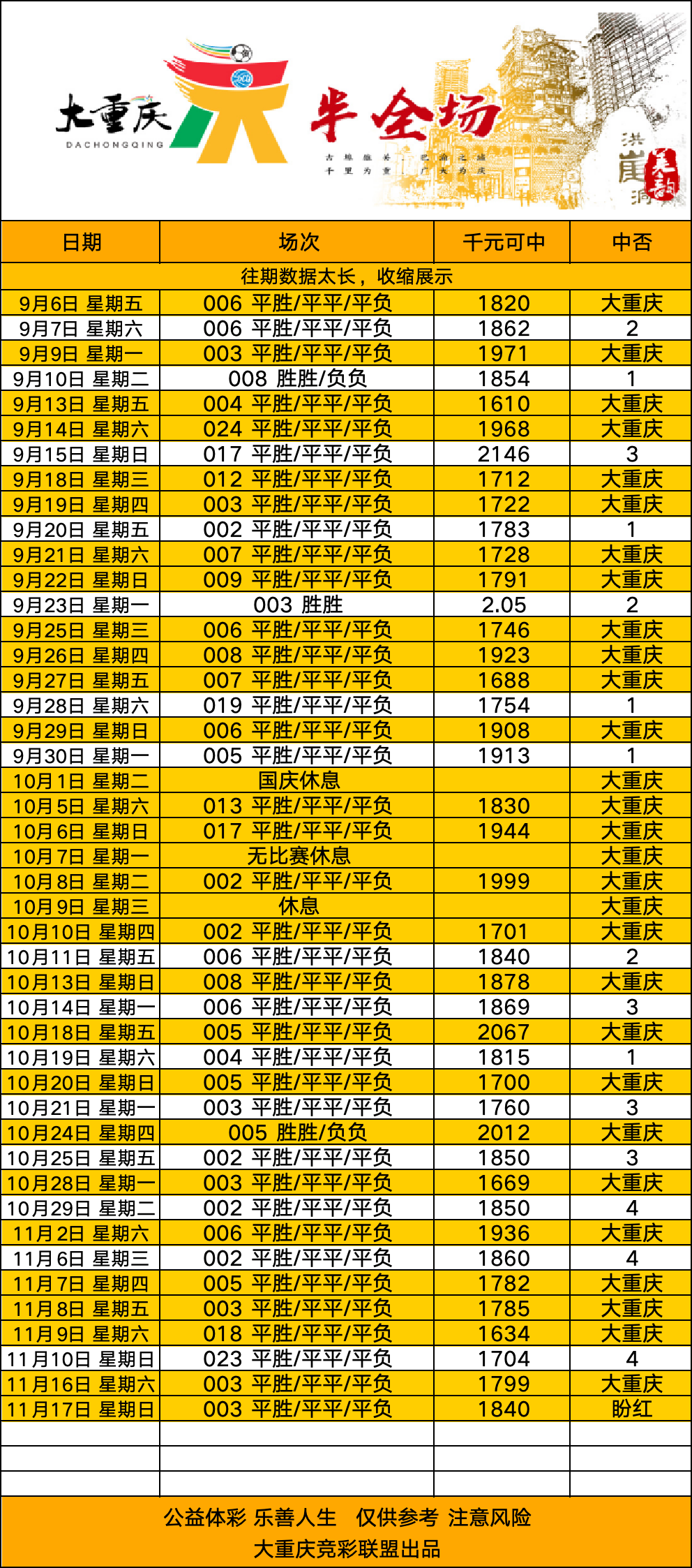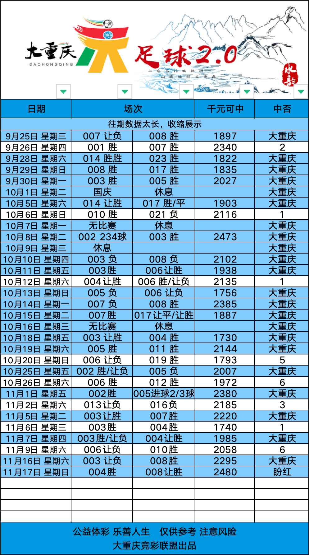 重庆南城帮帮团“大重庆”系列更新!大重庆系列涵盖以下6个产品:①山韵(足球3.0)②水韵(足球2.0)③美韵(足球半全场2.0)④桥韵(足球总进球2.0)⑤神韵(篮球胜分差2.0)⑥古韵(篮球3.0)以下3个产品未来根据情况再考虑⑦食韵(篮球2.0,已暂停更新)⑧财韵(足球4.0,已暂停更新)⑨幸韵(足球10.0,已暂停更新)